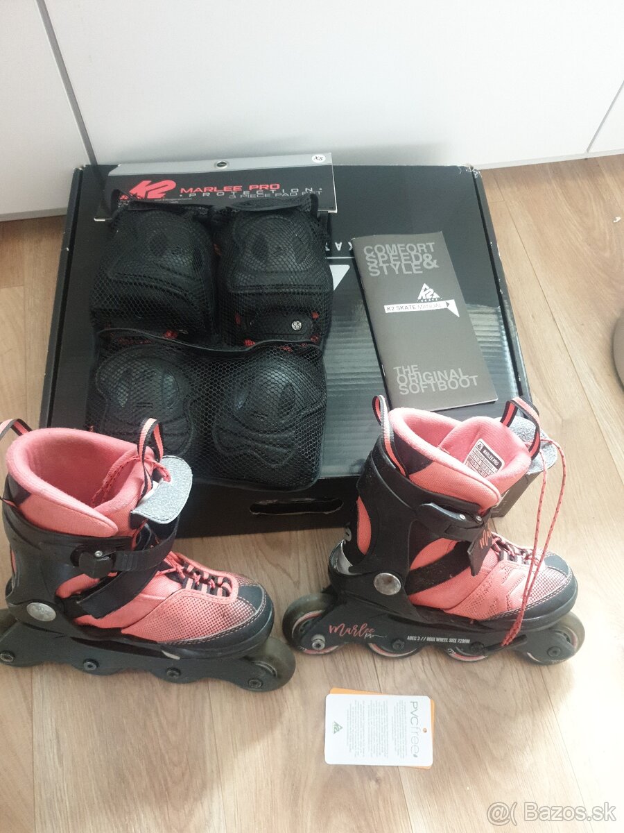 Dievcenske in-line kolieskove korcule zn.K2 Marlee v krasnej lososovej farbe v zachovanom stave- latka na jazyku he na jednom mieste zasita
