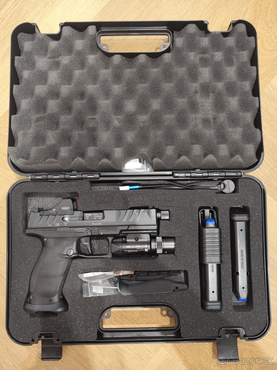 Ponúkam na predaj modernú pištoľ. Hlaveň so závitom 1/2" x 28 UNEF. Kaliber zbrane 9 mm Luger / 9 x 19 mm. WALTHER PDP PRO SD 5,1" FULL SIZE s kolimátorom Holosun SCS-PDP-GR a svetlom od firmy Olight BALDR PRO R Black + zelený laser. K zbrani dám ako bonus púzdro IWB Holster od Mustache Gear. Vystrelených do 1500 rán. Predávam to všetko spolu. Možná dohoda.