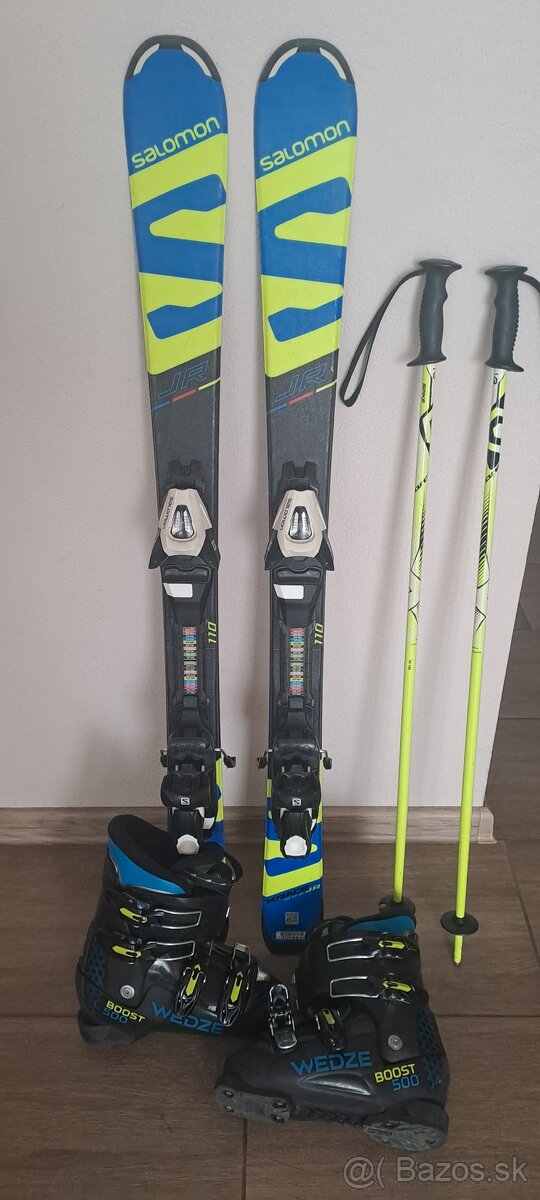 Predám komplet sadu pre malého lyžiara. Lyže Salomon sú ľahko ovládateľné, kvalitné, majú nastaviteľné viazanie Salomon,dĺžka lyží 105 cm, lyziarky 260 mm (čo zodpovedá nohe 35-36), plus palice. Cena 120 Eur.