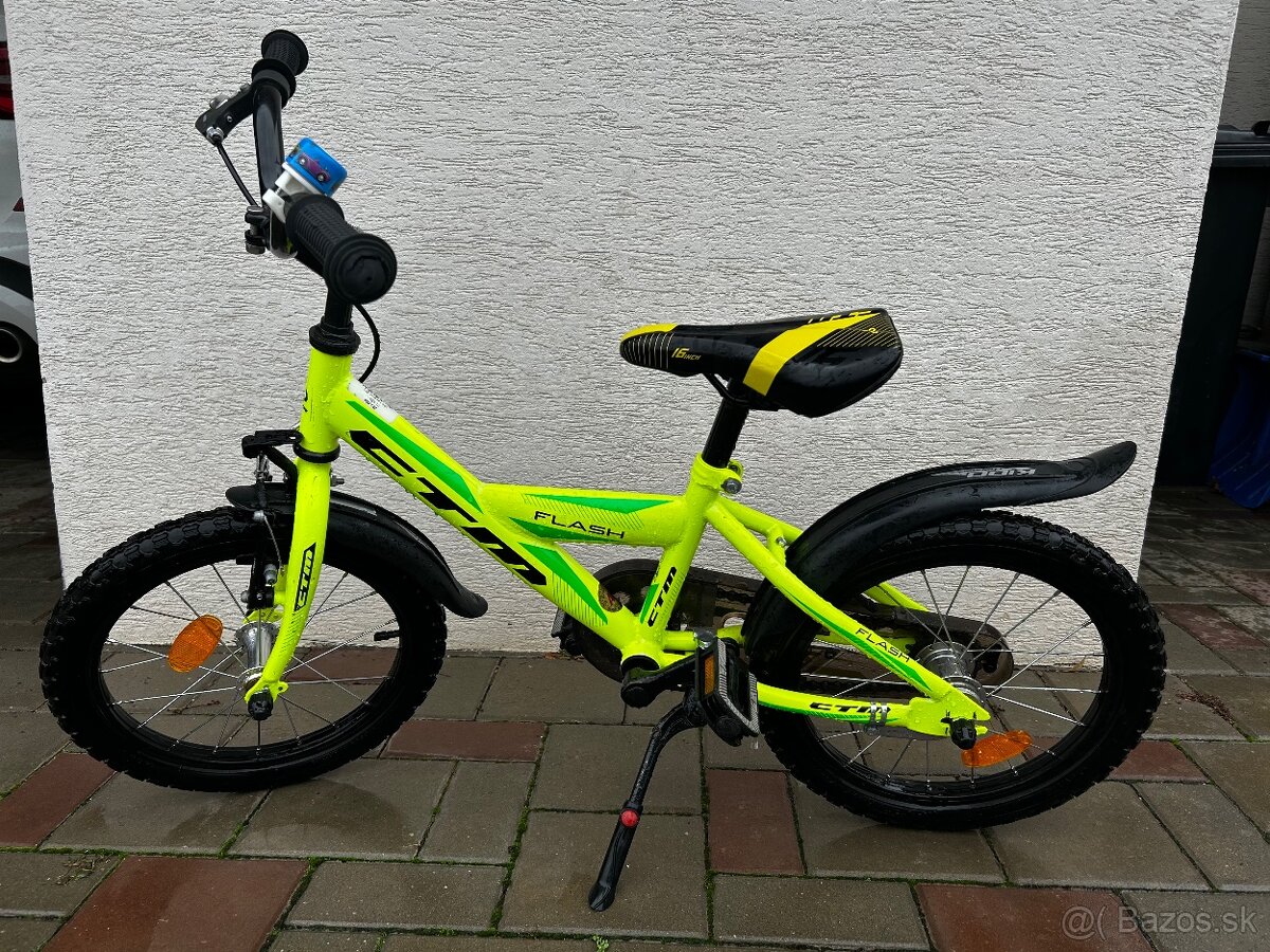 Predám detský žlto-zelený bicykel CTM veľkosť “16” vo výbornom stave, s blatníkmi a stojanom.