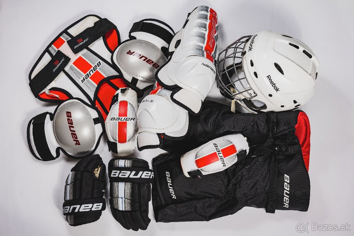 Detská hokejová výstroj Bauer Supreme PRO YTH - veľkosť XL - určená pre deti od výšky 120cm do 140cm v originálnej veľkej taške Bauer. Nohavice, rukavice, chrániče na lakte, prilba a vesta - ako nové, chrániče na kolená mierne poškriabané. Okres Púchov. Cena 130€.
