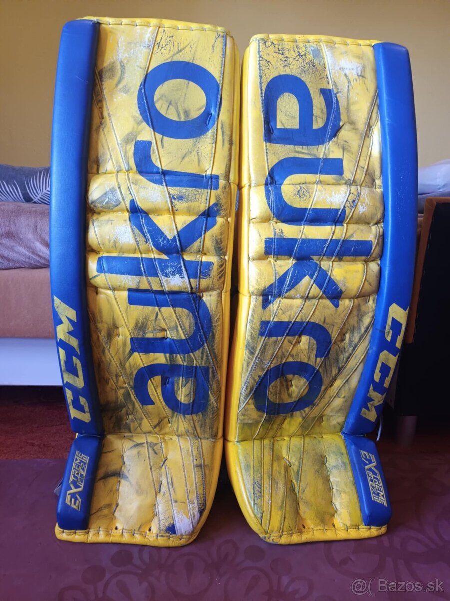Použité brankářské betony CCM Eflex 3, dělané na zakázku, velikost cca 34 + 2,5 - v minulosti hrané v české extralize, stále ve slušném stavu, stále dostatečně tvrdé, semtam je nějaká povrchová oděrka a je trochu oprýskaná barva místy, samozřejmě na betonech jsou šmouhy od puků, ale jinak upínaní k noze je plně funkční, včetně upínacích gum a suchých zipů, určitě se hodí i na amaterský hokej vyšší úrovně. PS: v případě zájmu mám k betonům i br. rukavice v podobných barvách, také custom.