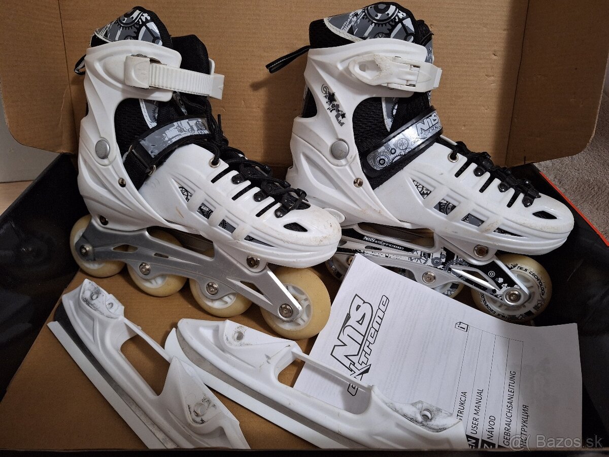 Predám používané nastaviteľné korčule zn. NILS extreme LED. Sada 4v1:kolieskové korčule,zimné korčule,trekové korčule,kolieskové a trekové korčule.Možné nastaviť na veľkosť 35-38. V tme pri jazde sú kolieska svietiace. Súčasťou je aj sada na výmenu koliesok za nože.