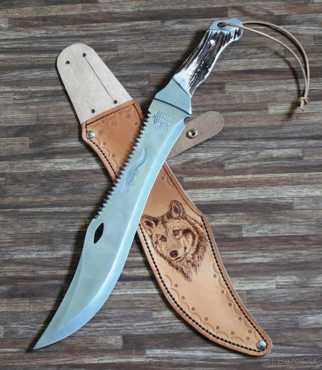 Wolf mačeta je vhodná pre turistov, skautov, poľovníkov či rybárov. Mačetu okrem iného využijete na chalupe, či v záhrade na rýchle osekanie vysokej buriny, či chrapačiny. Na čepeľ z kvalitnej nerezovej ocele , sú urobené črienky z pravého jelenieho parožia s pekným perlovaním, takže rúčka je jedinečná , neopakovateľná. Rúčka je špeciálne tvarovaná, aby dobre sedela v dlani. Na hornej hrane čepele je pílka z dvojradových ostrých zubov. K mačete patrí ručne šité kožené opaskové púzdro z kvalitnej hovädzej kože - hladenice. Púzdro je impregnované špeciálnym olejom na kožu. Na púzdre je ručnou pyrografickou technikou urobený obrázok hlavy vlka. Dĺžka mačety 47 cm. Dĺžka čepele 32 cm. Hmotnosť mačety 471 gr. Mačeta je prakticky nová, dosiaľ nepoužitá. Cena 57,- + poštovné / dobierka 6.- Eur.
