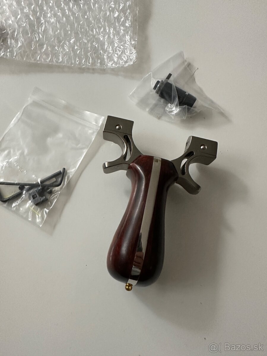 Predam profi lovecky prak, Slingshot, gumipusku, kombinacia uslachtilej ocele s drevenou ruckou s plochou gumou. K praku je jedna guma, imbusove kluce, nahradne skrutky, mieridla a laserovy zameriavac (baterie nie su sucastou balenia).