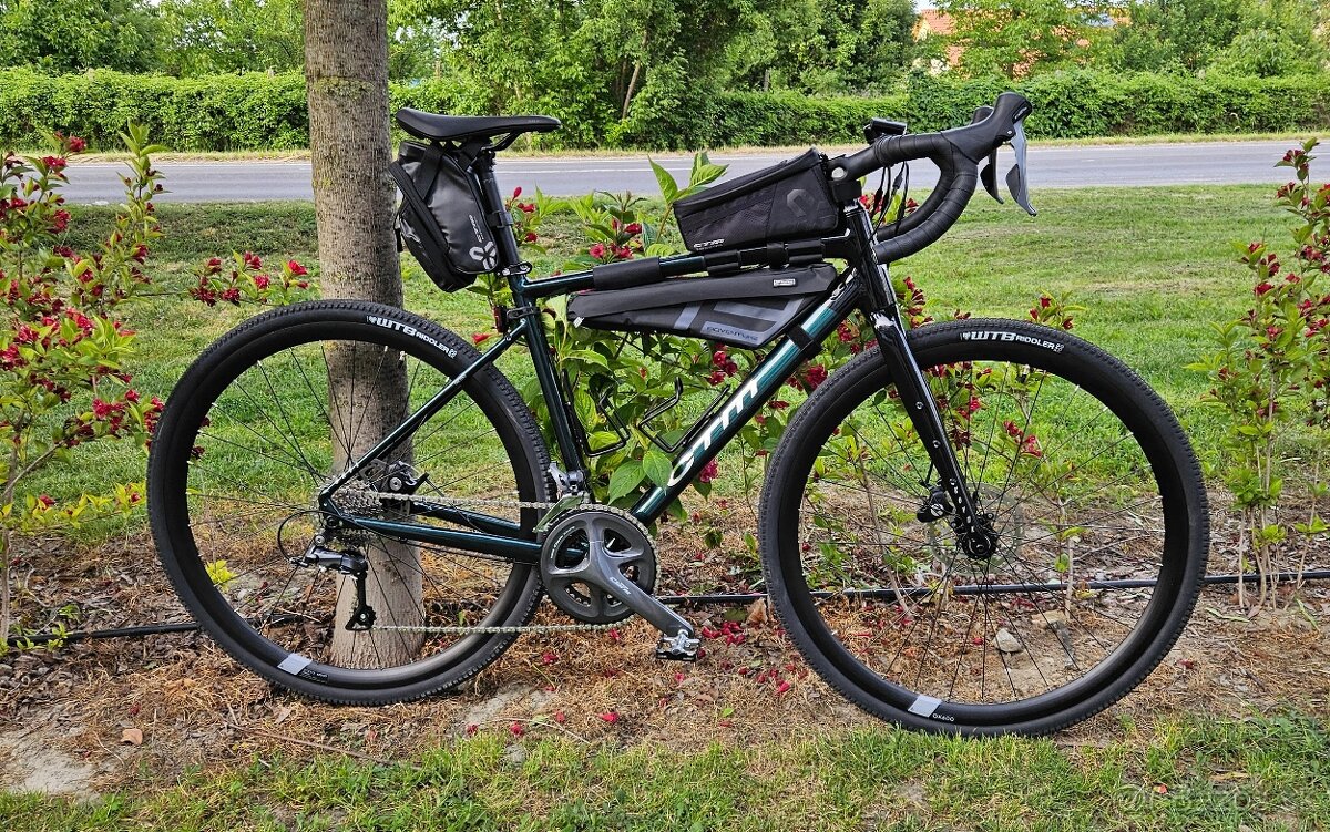 Hliníkový rám a vidlica, výbava Shimano Claris 2x8, kotúčové brzdy Tektro, náboje Novatec s priemyselnými ložiskami, plášte WTB 37mm. Dajú sa použiť užšie aj širsie - max 45mm