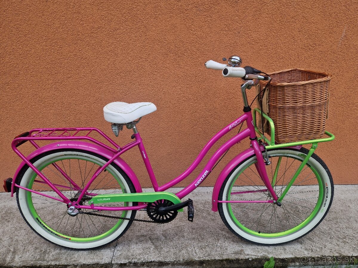 Predám retro bycikel Kenzel dámsky ako nový. Veľmi málo používaný, žiadne známky používania. Vzadu ma dve rychl9sti na prehadzovanie +košík. Veľkosť kolies 26'. Nutné vidieť.!!pôvodná cena s košíkom 550 eur.