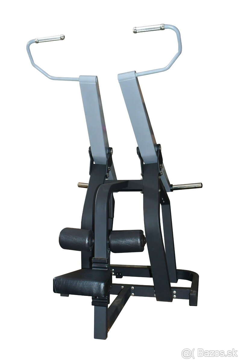 Profesionální posilovací stroj k procvičení zádových svalů v sedě s oporou pro stehna. Jako závaží se používají olympijské kotouče s průměrem otvoru 50 mm.