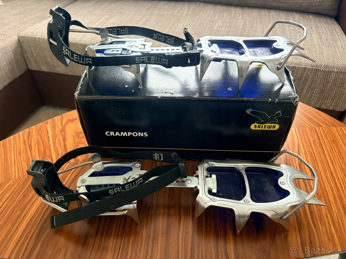 Predám nové nepoužívané automatické „mačky“ - stúpacie železá - Salewa Alpinist Step-In 816 steel/blue. Automatické viazanie slúži pre bezpečné a jednoduché upnutie. Je vhodné na technickú obuv s drážkou na päte i na špičke. Ľahké 12-hrotové hliníkové mačky sú vhodné na ľadovcovú turistiku, vysokohorskú turistiku a skialpinizmus. Sú vybavené podložkami proti nalepovaniu snehu. Veľkosť je nastaviteľná od 36 do 47. Hmotnosť mačiek je cca 700 g.