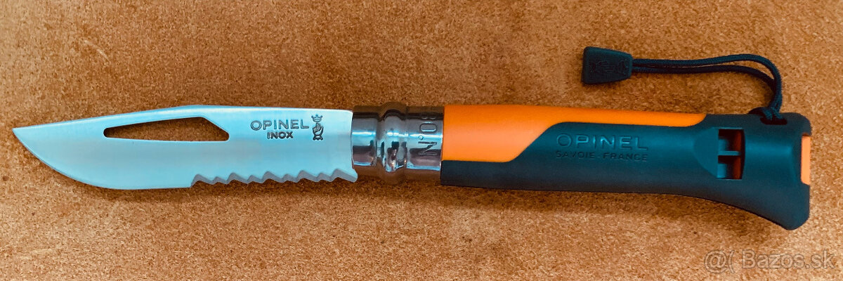 Vo Francúzsku vyrobený zatvárací nôž firmou Opinel, vhodný na outdoorové aktivity - kemping, jachting, horolezectvo, kanoistika, potápanie a pod. Čepeľ dlhá 8,2 cm, hrúbky 3,5 mm je z nerezovej ocele. Celková dĺžka 19 cm. Poistka Virobloc. V čepeli nachádzajúci sa uvoľňovač strmeňov využijú milovnícky jachtingu. Rukoväť je z oranžovo - šedého nekĺzavého plastu s integrovanou píšťalkou (110 db, vzdialenosť 300 m). So šnúrkou zo syntetického materiálu.