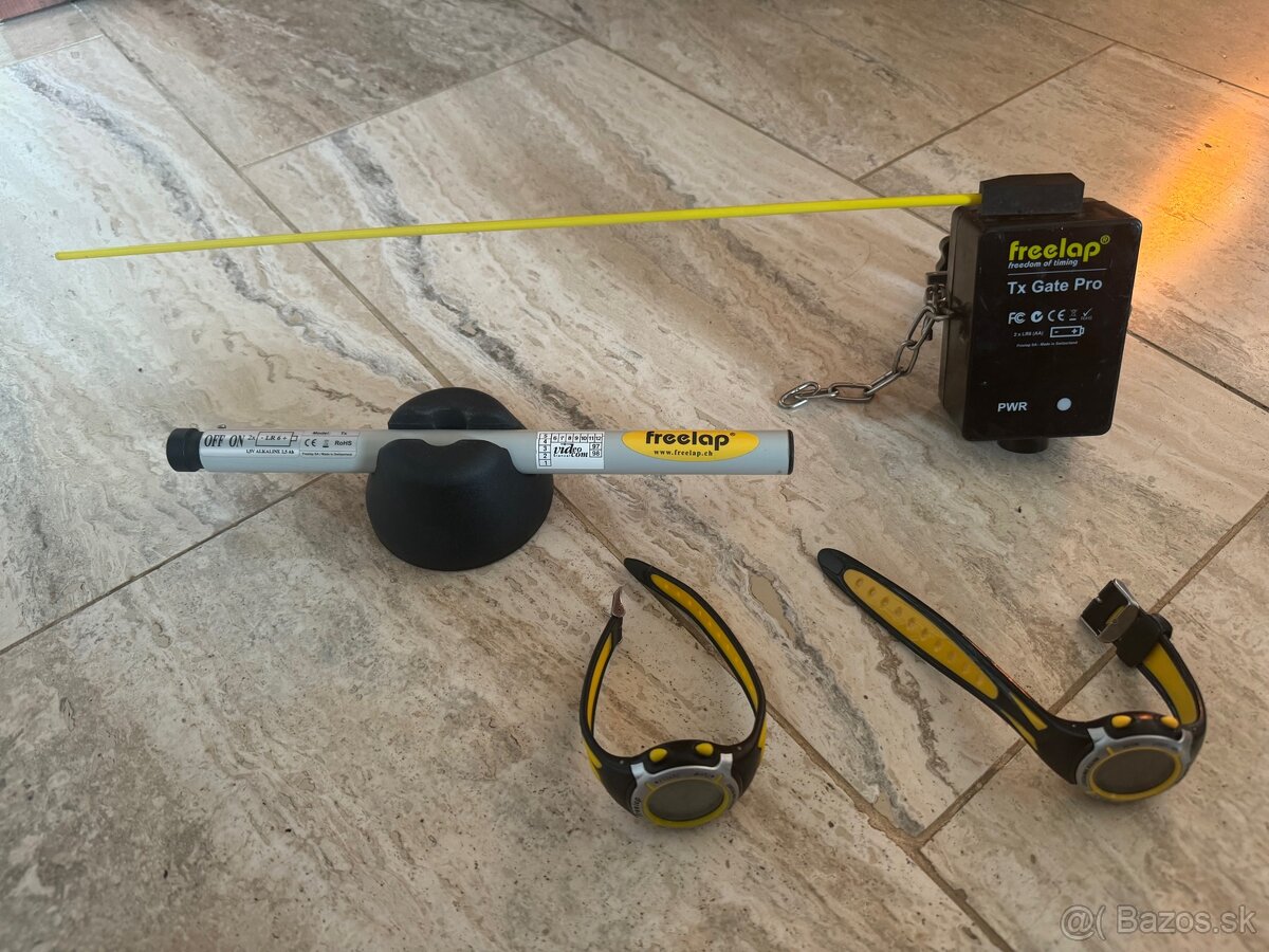 Minimálne používanú plne funkčnú lyžiarsku časomieru značky freelap s dvomi hodinkamy a štartovacou a cielovou bunkou.