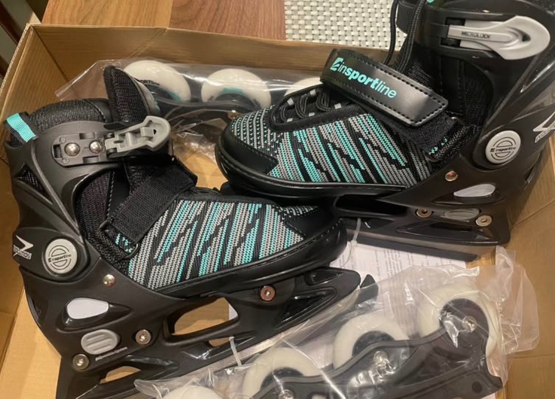 Predám úplne nové (ani raz nepoužité) korčule na ľad aj kolieskové, nastaviteľné od veľ. 33 do veľ. 36.