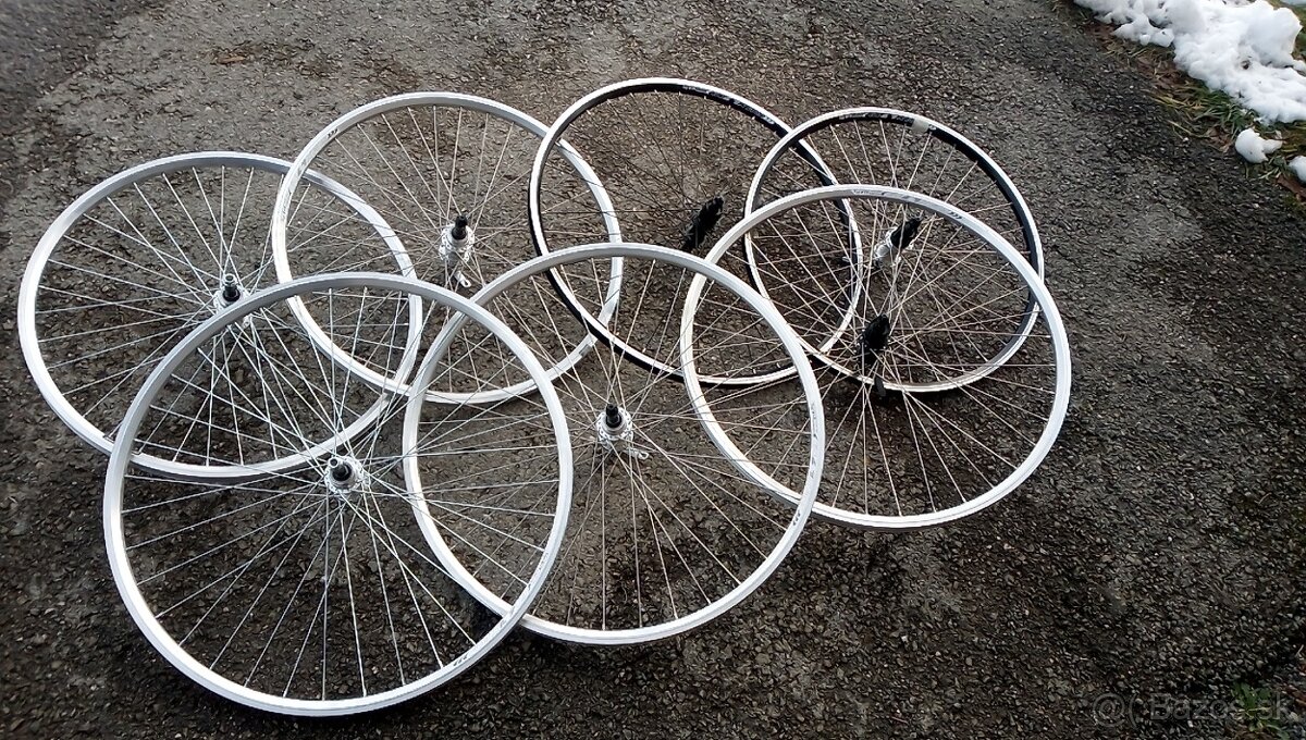 Nové kolesá vo viacerých verziách vyhotovení, kazetové/na koliečko, veľkosti 24", 26" a 28", na klasické V-brzdy. Cena 20 - 39 / kus, podľa druhu. Všetky majú dvojstenné ráfiky najbežnejšej šírky 19 mm