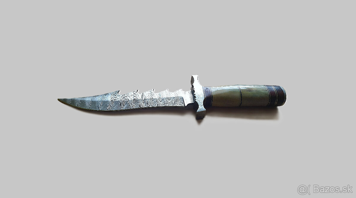 Veľký ručne vyrobený lovecký nôž, ktorý sa pýši robustným a jedinečným dizajnom. Čepeľ je zhotovená z prvotriednej damaškovej ocele, ktorá je známa svojou mimoriadnou pevnosťou, ostrosťou a nezameniteľným vzorom. Rukoväť je vyrobená z kombinácie byvolej kosti, kovu a dreva, čo dodáva nožu nielen štýlový vzhľad, ale aj výborný uchop.