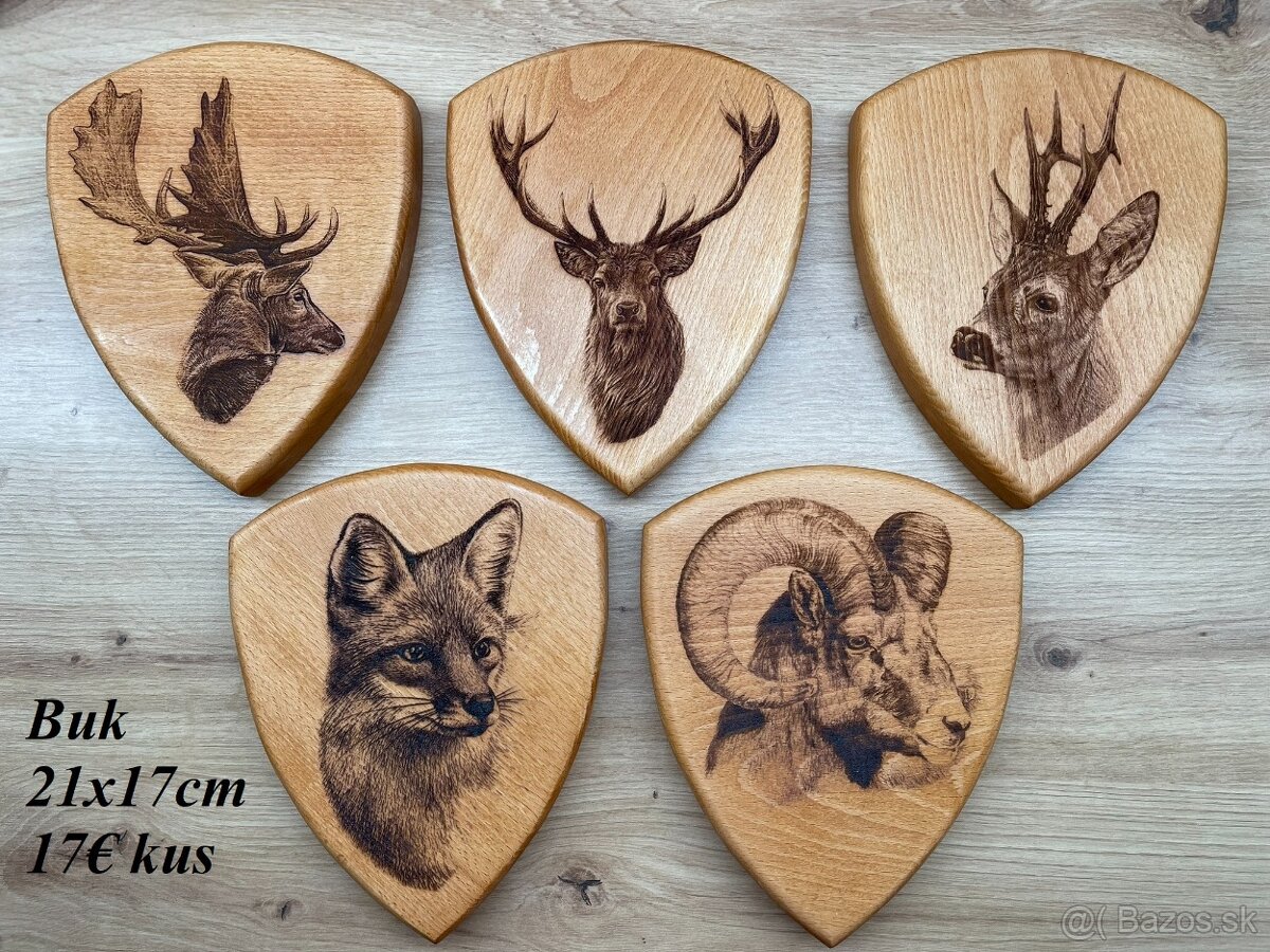 Drevené podložky pod trofeje a plakety s vypaľovaním z bukového dreva. Ceny a rozmery na fotografiách.