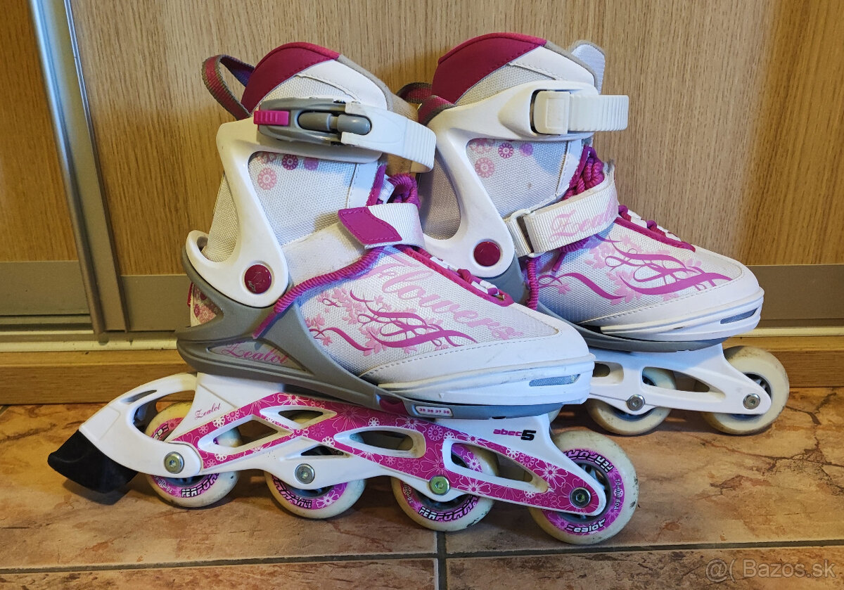 ponúkam na predaj krásne, dievčenské, bielo ružové in-line korčule. veľmi zachovalé po jednej sezóne. korčule majú nastaviteľnú veľkosť 35-38. kolieska ABEC5, 70mm/80A. + sada chráničov grátis
