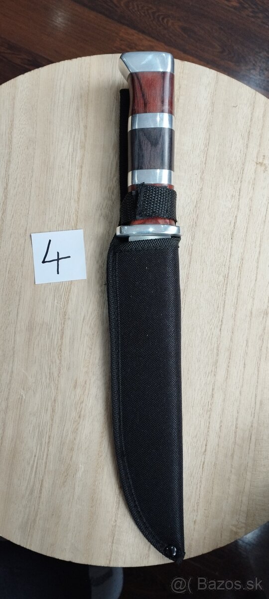 Na predaj nový lovecký nôž z nerezovej ocele s nylonovým púzdrom a drevenou rukoväťou.