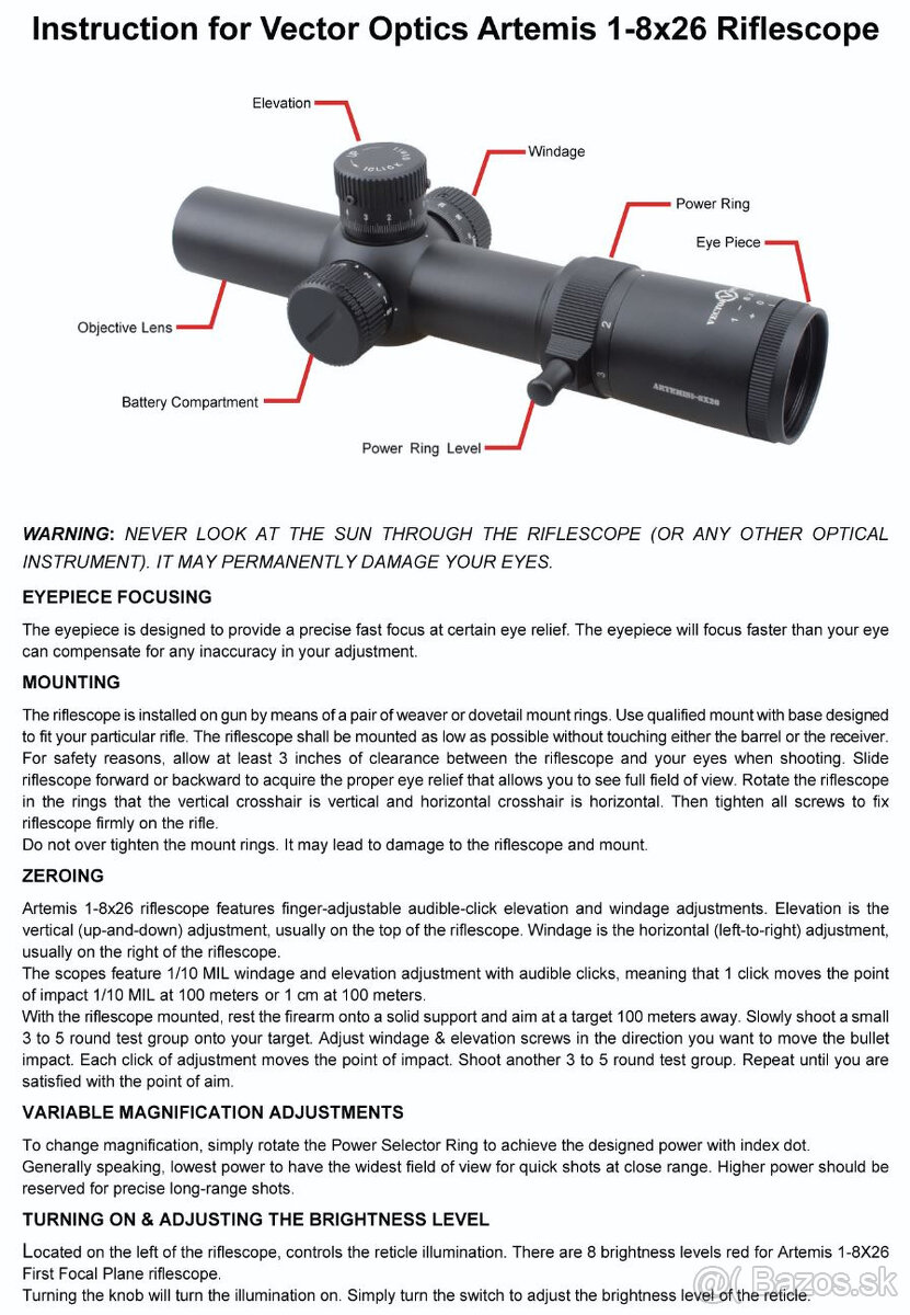 Ponúkam na predaj optiku od Vector Optics, Artemis 1-8x26. Stav optiky nová, vystrelených 100ks. Kupovaná za 415€ (bloček priložím k optike) koncom roka 2021, záruka platná do 2026.