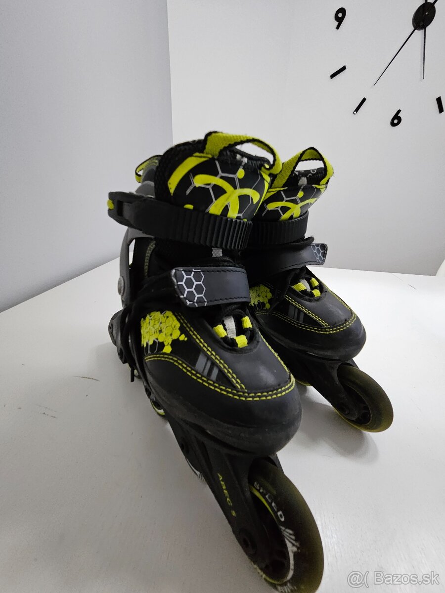 Predám detské kolieskové korčule – neznačkové, v čierno-žltom prevedení.