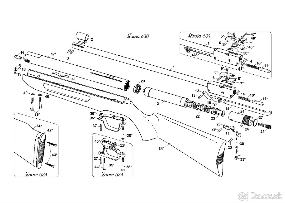 1 Hlaveň 2 Muška 3 Šroub mušky (2x) 4 O kroužek 5 Klapka hledí 6 Čep klapky 7 Plátek hledí 8 Vložka hledí 9 Výškový šroub 10 Pružina záskočky 11 Záskočka * 12 Článek 13 Kolík článku 14 Napínací páka 15 Kolík napínací páky 16 Narážka 17 Pouzdro 18 Spojovací šroub 19 Śroub 20 Těsnění pístu 21 Píst 22 Pružina pístu 23 Vedení pružiny 24 Uzávěr pouzdra 25 Pojistka 26 Západka pojistky 27 Pružina pojistky 28 Záchyt pístu 29 Kolík 4x16 30 Spoušt 31 Pružina spouště 32 Kolík 4x20 33 Pero spouště 34 Pažba 35 Lučík 36 Podložka lučíku 37 Šroub lučíku 38 Zadní šroub pažby * 39 Přední šroub pažby (2x) * 40 Podložka vějířovitá (2x) 41 Vodítko 42 Botka 43 Šroub botky (2x)* 44 Regulační šroub 45 Kroužek pojistný třmenový (3x)* 46 Táhlo 47 Stranový šroub 48 Podložka pružná 49 Stavítko hledí 50 Pero hledí 51 Vedení pružiny záskočky