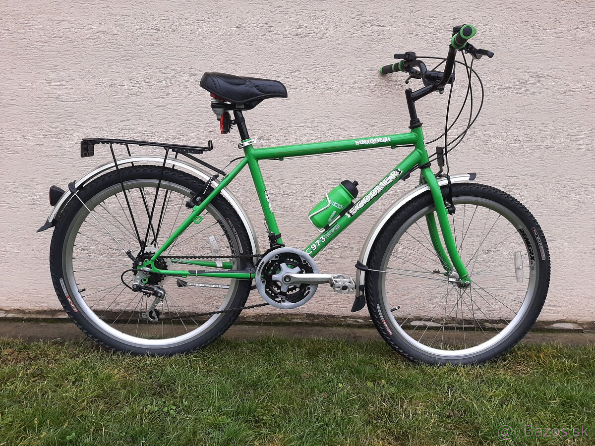 Predám zachovalý bicykel, veľkosť rámu 45,5 cm, kolesá 26×1,95, prevody 3x6, V-brzdy, osvetlenie.