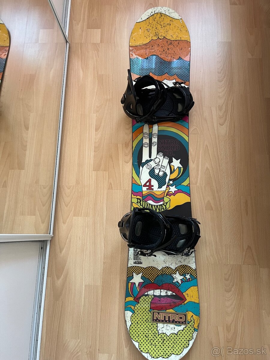 Na predaj snowboard Nitro s viazaním Ride veľkosť viazania M. Dĺžka snowboardu 142cm. Bežne známky opotrebovania ma už niečo za sebou. Zohľadnené v cene. Dobrý na učenie pre niekoho kdo nechce na začiatok veľa investovať do výstroje. Odber možný v Bratiskava- Petržalka.