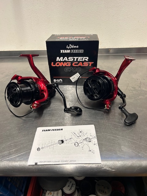 Predám 2 ks,nevyužite 2 ročné navijaky BY DÖME Master Long cast 6700 veľmi málo používané bez škrabancov na ďaleké hody s elegantným prevedením, červeno-čiernym dizajnom. Long Cast je veľký robustne postavený navijak, ktorý je relatívne ľahký a váži len 534g. s prevodovým pomerom 4,6:1 Ma 6+1 ložiská, šnekové zdvíhanie cievky. Hliníková cievka na dlhé hody priemerom 69 mm s dvoma klipmi. Na jedno otočenie kľuky navinie 97 cm. Cena 150 za oba