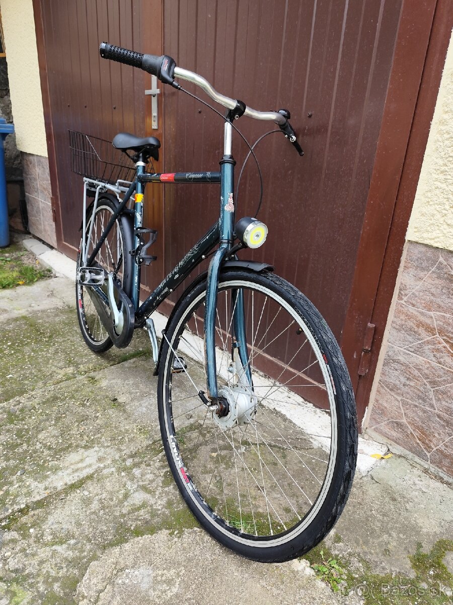 Predám tento bicykel s hliníkovým rámom po veľkom servise, nové: plášte a duše, nová reťaz, kľuky, pastorok, blatníky, svetlá, pedále, sedlo, radenie, ....bicykel má 7 prevodov, radenie Shimano, predná brzda Shimano .......bicykel v 100% stave, bicykel vhodný pre osoby od výšky 180cm