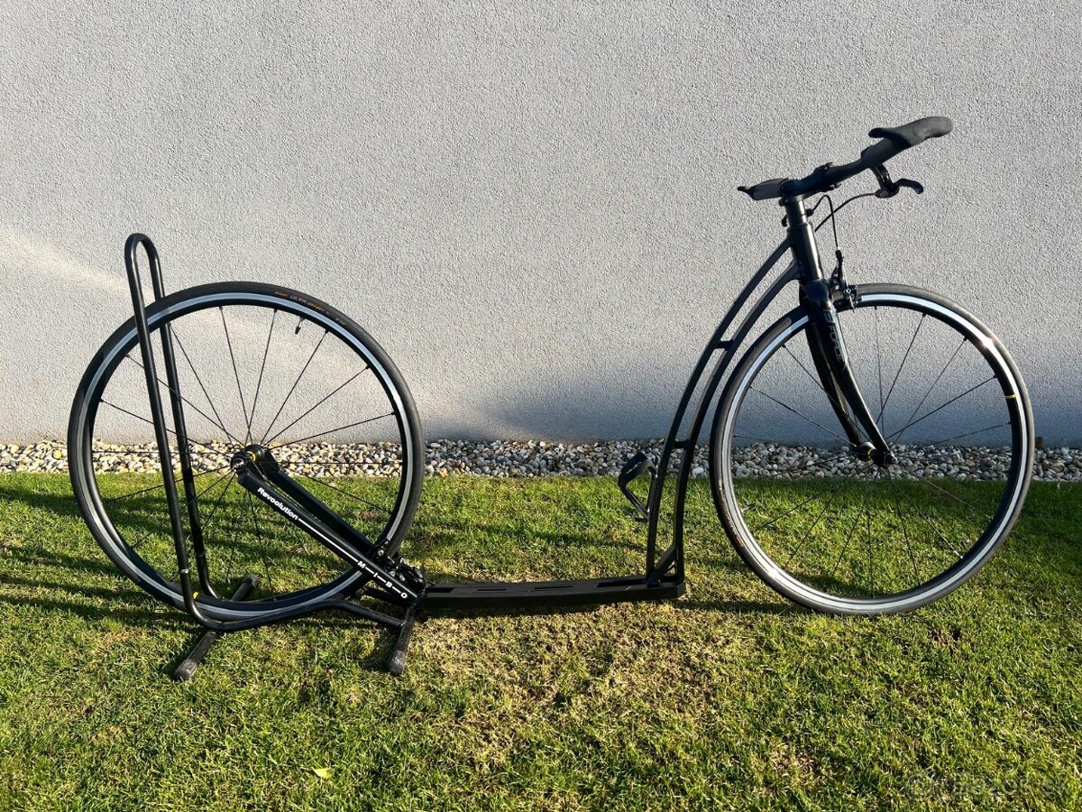 Cestná pretekárska kolobežka na oceľovom ráme, s kolesami Mavic a pneumatikami Continental Ultrasport III. 28" predné koleso, 28" zadné koleso 44 cm nášľapná plocha 4 - 5,9 cm svetlá výška hmotnosť 8,2 kg nosnosť 150 kg dĺžka 191,5 cm výška 90 cm