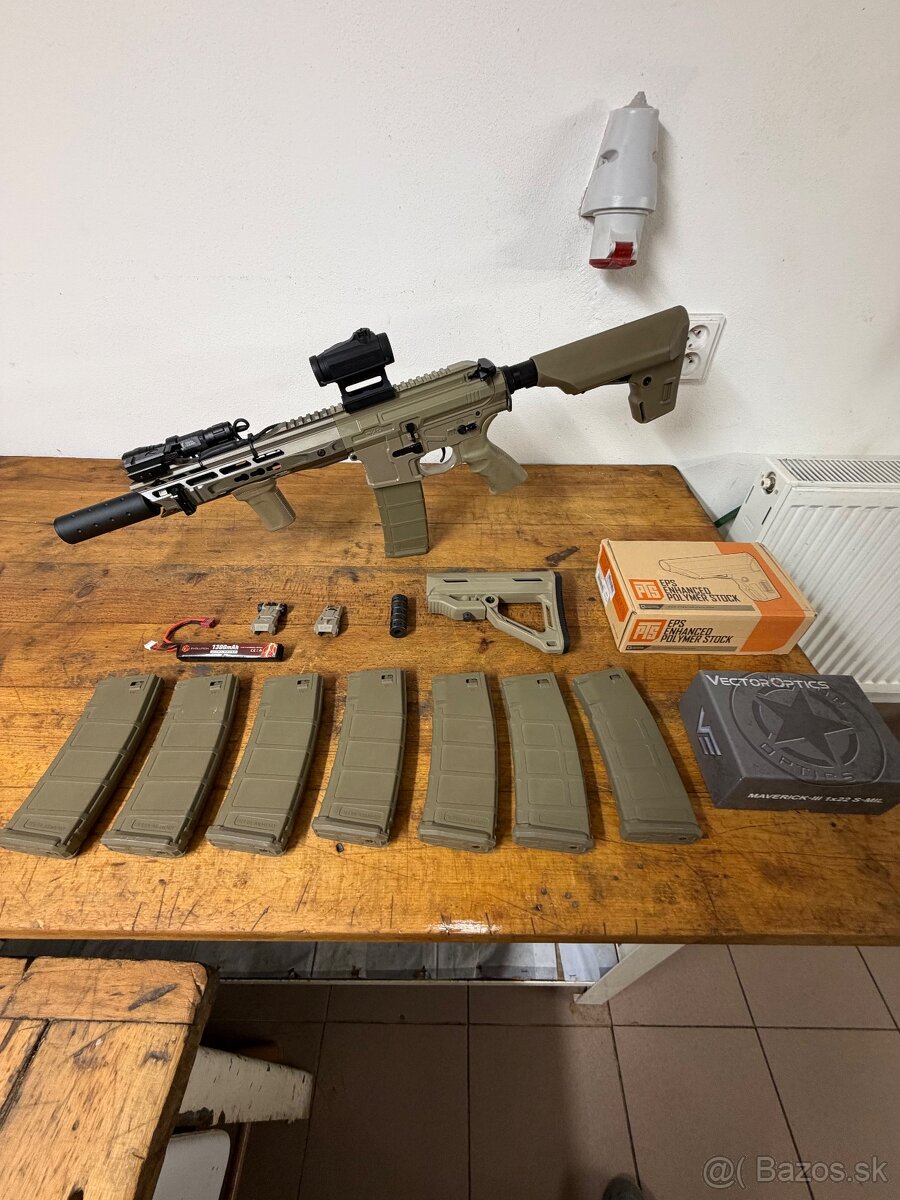 Cenu ponúknite. Predám túto krásnu MARSKU od ICS s deleným mechom, procesorovou jednotkou SSS a automatickým uvolnením piestu po zaistení. Je vyladená na CQB kde má 1,6J s vahou 0,32g (viď.foto). Predám ako celý komplet. Nový kolimator MAVERICK-III od VectorOptics, svetlo s rýchlospúšťou, tlmič, pažba PTS (originál pridám tiež), 8 tlačmých zásobníkov (každý na 130bb) a baterka 1300 - 20/40C. Tento set ma stál cca 900€.