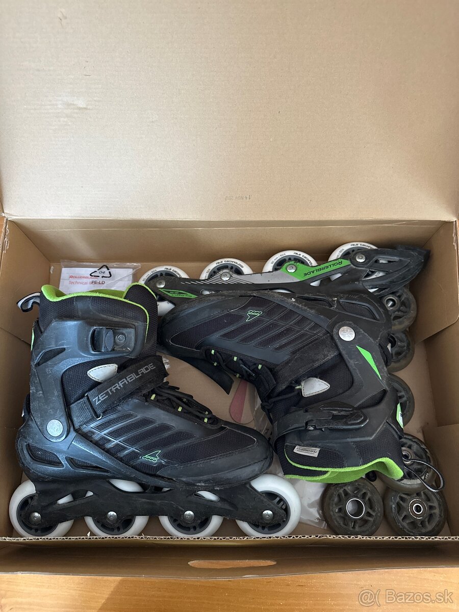 Predám kolieskové korčule Zetrablade veľkosti 42 kolieska nové 82 mm s väčšinou aj nových ložísk. Korčule už majú niečo odžite a majú škrabance (bežná vzhľadova vada) pridávam staré kolieska a náradie na doťahovanie koliesok. Všetko v krabici aj s papiermi. Pôvodná cena 90€ viď. obrázok