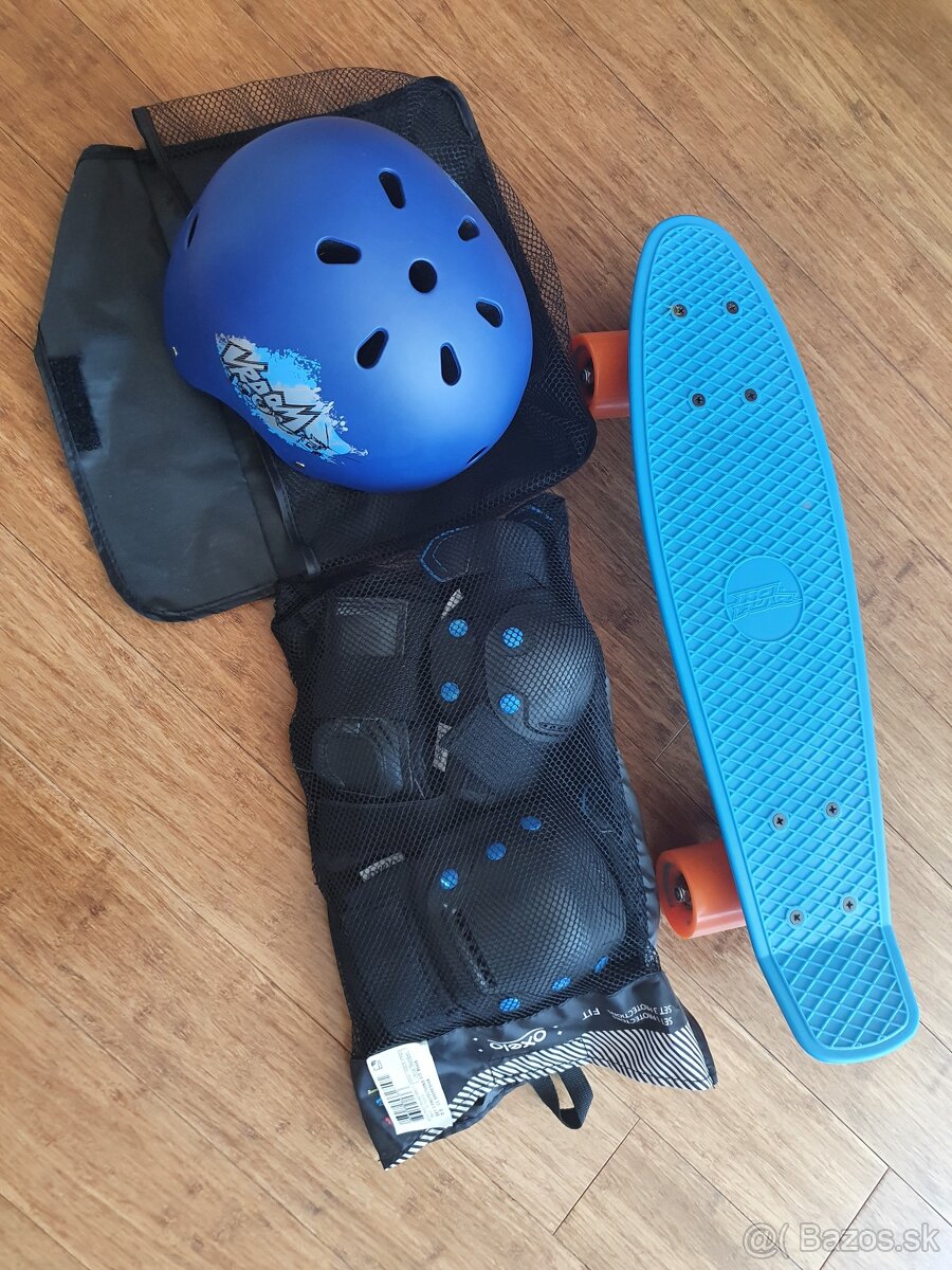 Predám úplne nový nepoužívaný pennyboard spolu s kompletnými novými chráničmi (kolená, lakte, zápästia) a novou prilbou, všetko v modrej farbe, veľkosť S, cena 105,-€ + poštovné
