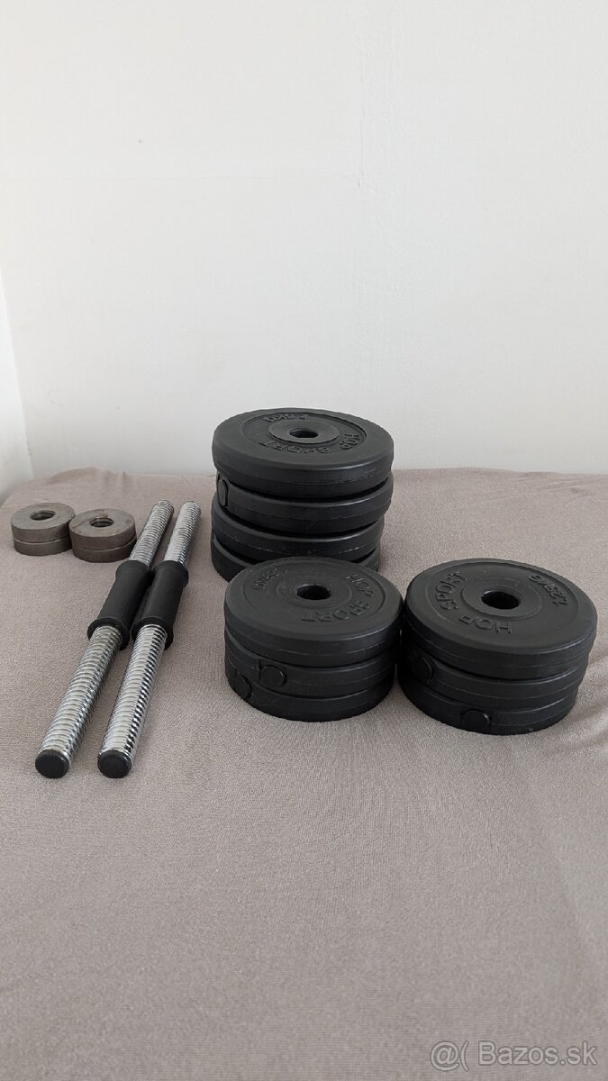 Na predaj mám aj samostatné dve jednoručné činky s 20kg závažiami - v prípade záujmu pozrite môj druhý inzerát.