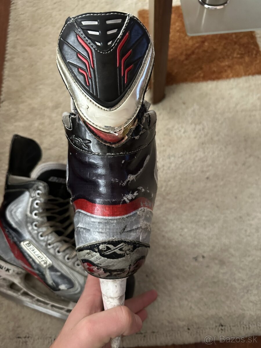 Predám používané pánske korčule Bauer APX, veľkost 45,5. Na ľavej korčuli poškodený zadný jazyk. Cena 50 eur, dohoda možná.