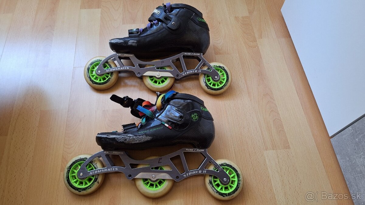 Predám používané Luigino ultra challange korčule. Veľkosť EU 39. Na ľavej topánke je zlomené uchytenie pracky ( viď foto ), nože, ložiská sú v dobrom stave. Možnosť termoúpravy topánok.