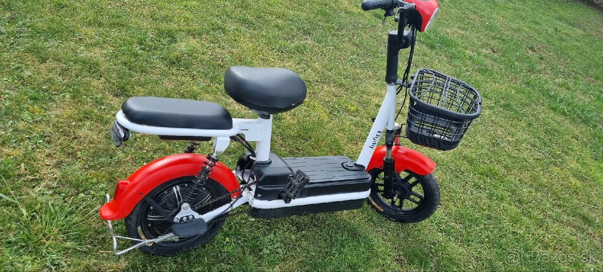 Predám elektrický skúter 4 ročny (často klasifikovaný aj ako elektrický bicykel kvôli pedálom), dodávaný s košíkom a zadným sedadlom pre spolujazdca.