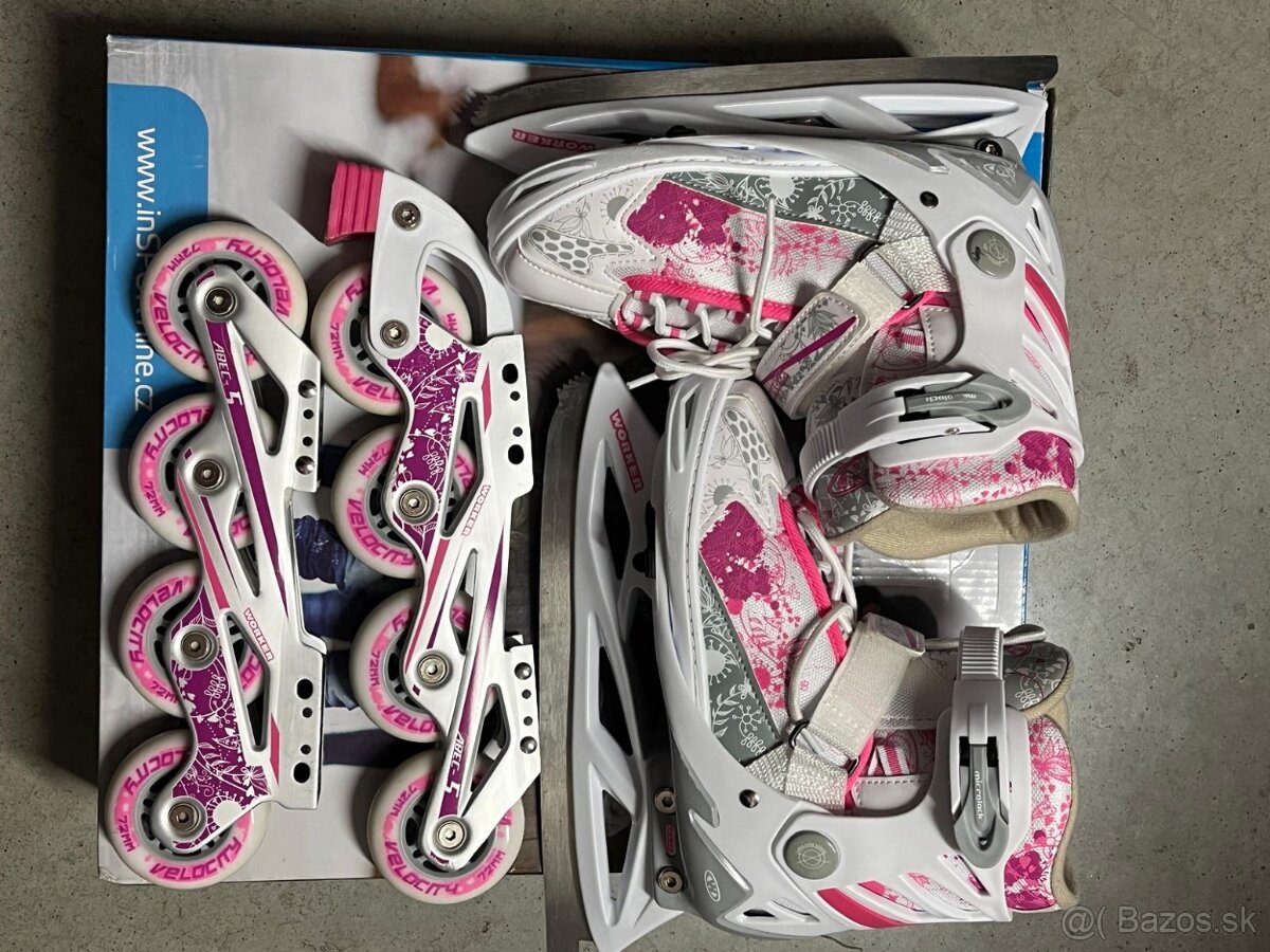 Predám dievčenské korčule 2v1, čiže aj na ľad aj ako kolieskové, veľkosť nastaviteľná 36-39, po 1 dietati, trosku su oskrete pri používaní, pridávam detail foto, ale inak ok.Kolieska aj nože vo veľmi dobrom stave. Povodne cca 60e