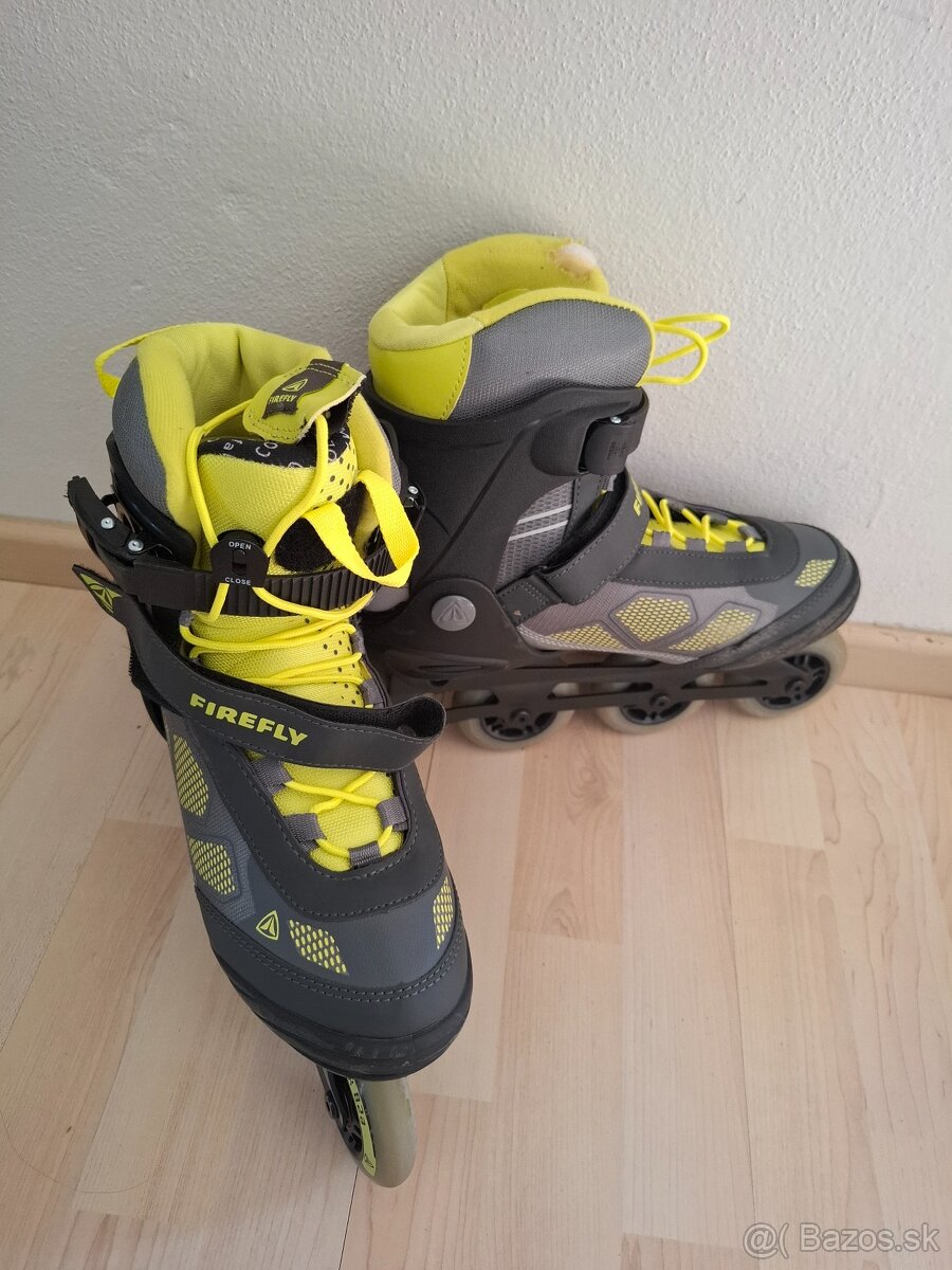 Predám pánske kolieskové korčule Firefly, veľkosť 43, kolieska 84 mm. Futro na ľavej korčuli je mierne poškodené.