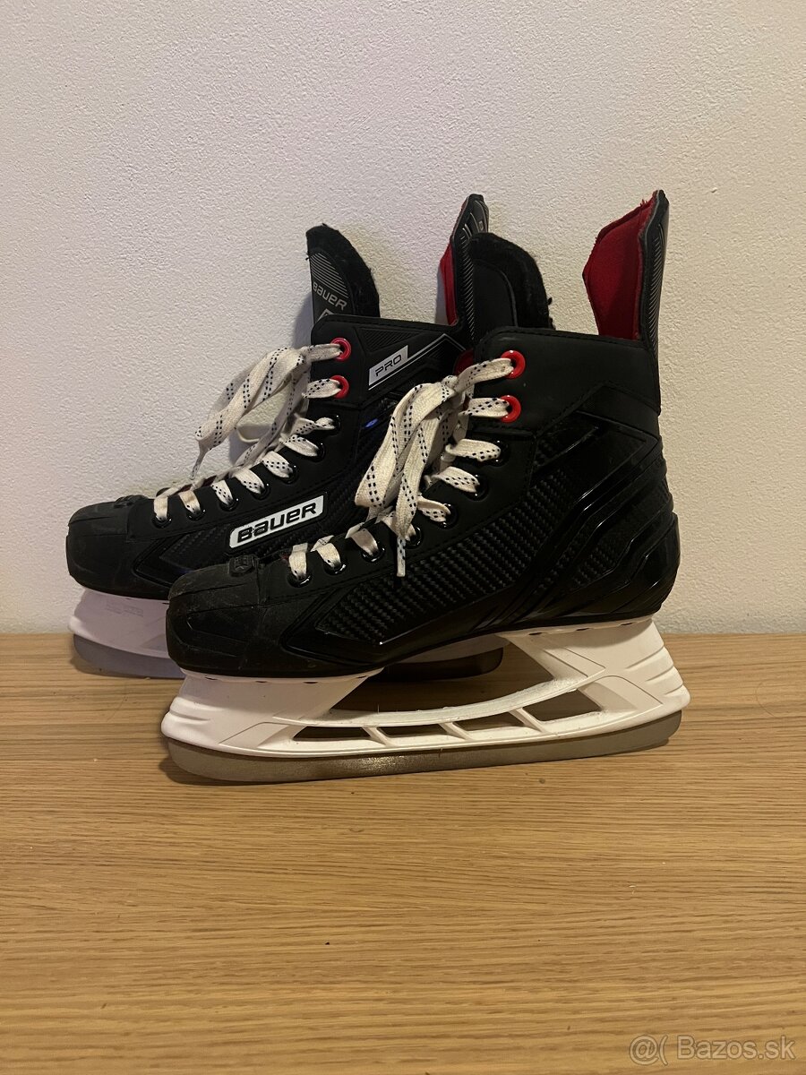 Hokejové korčule v čierno-bielej farbe s červeným vnútrom. Veľkosť- 38,5. Značka Bauer. Dôvod predaja synovi podrástla noha.