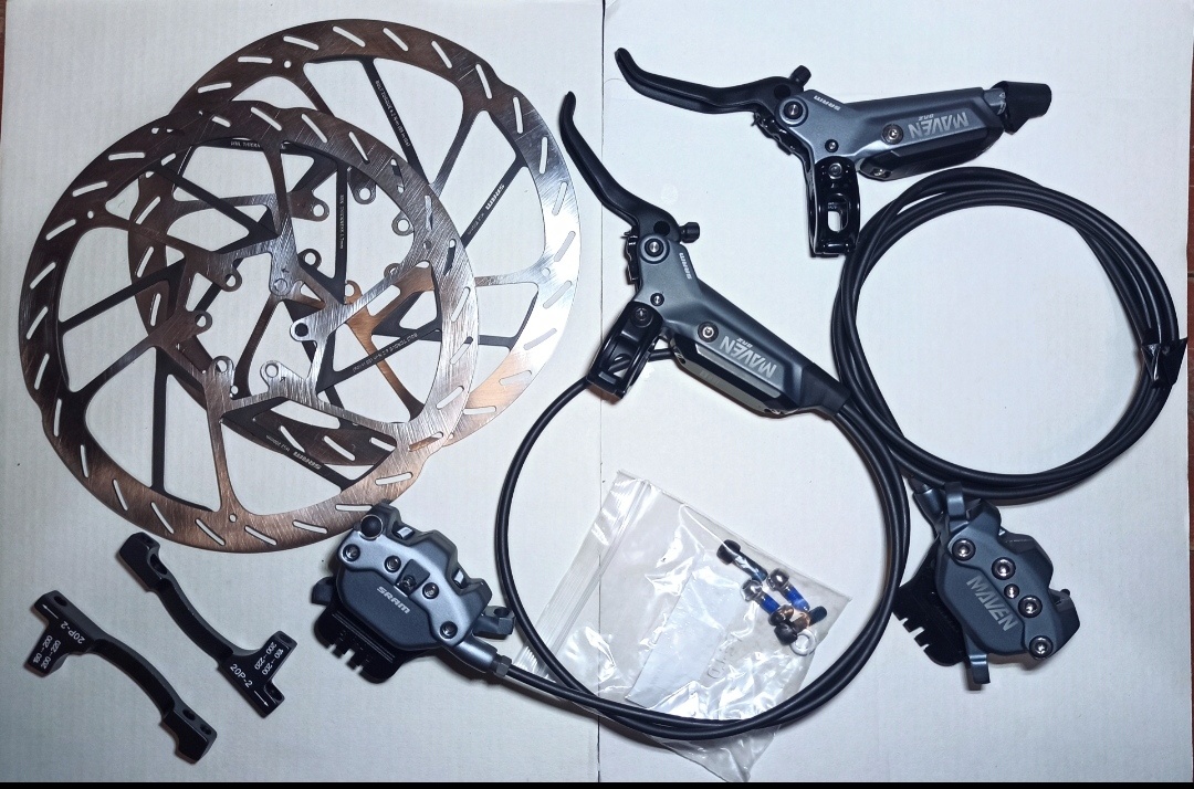 Predám nové brzdy zhodené z bicykla. Nikdy nejazdené. V cene spolu s kotúčmi HS2(200mm) a adaptérom F+R.