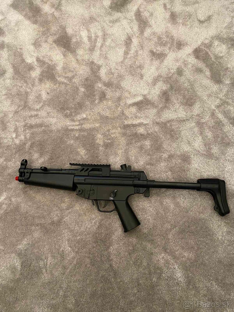 Predám automatickú airsoftovú repliku HK MP5. Je celoplastová, ľahká a dobre sa s ňou manipuluje. Strieľa výborne, plne funkčná. Používa 6 mm BB. Má posuvnú pažbu. Prepínač streľby je trochu poškrabaný, inak je všetko v poriadku.V cene je aj zasobnik.