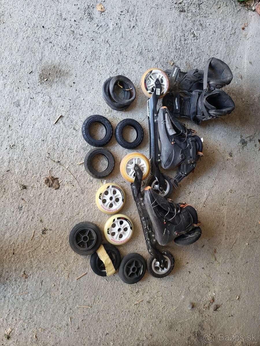 Predám xc kolieskové korčule Powerslide a mnoho príslušenstva k nim . Kolieska sú nafukovacie , alternatíva rýchle nylonové kolieska . Topánka je veľkosť 44 , alternatíva premontovanie na obyčajnú obuv .Sú k nim 4 kolieska z umelej hmoty nafukovacie , 2 kolieska duralové nafukovacie , 4 kolieska rýchle nylonové , 4 ks náhradných plášťov, 4 ks náhradné duše a dva sety karbónových palíc 160 cm, cena 160 eur , volajte prosím alebo sms na email neodoovedám