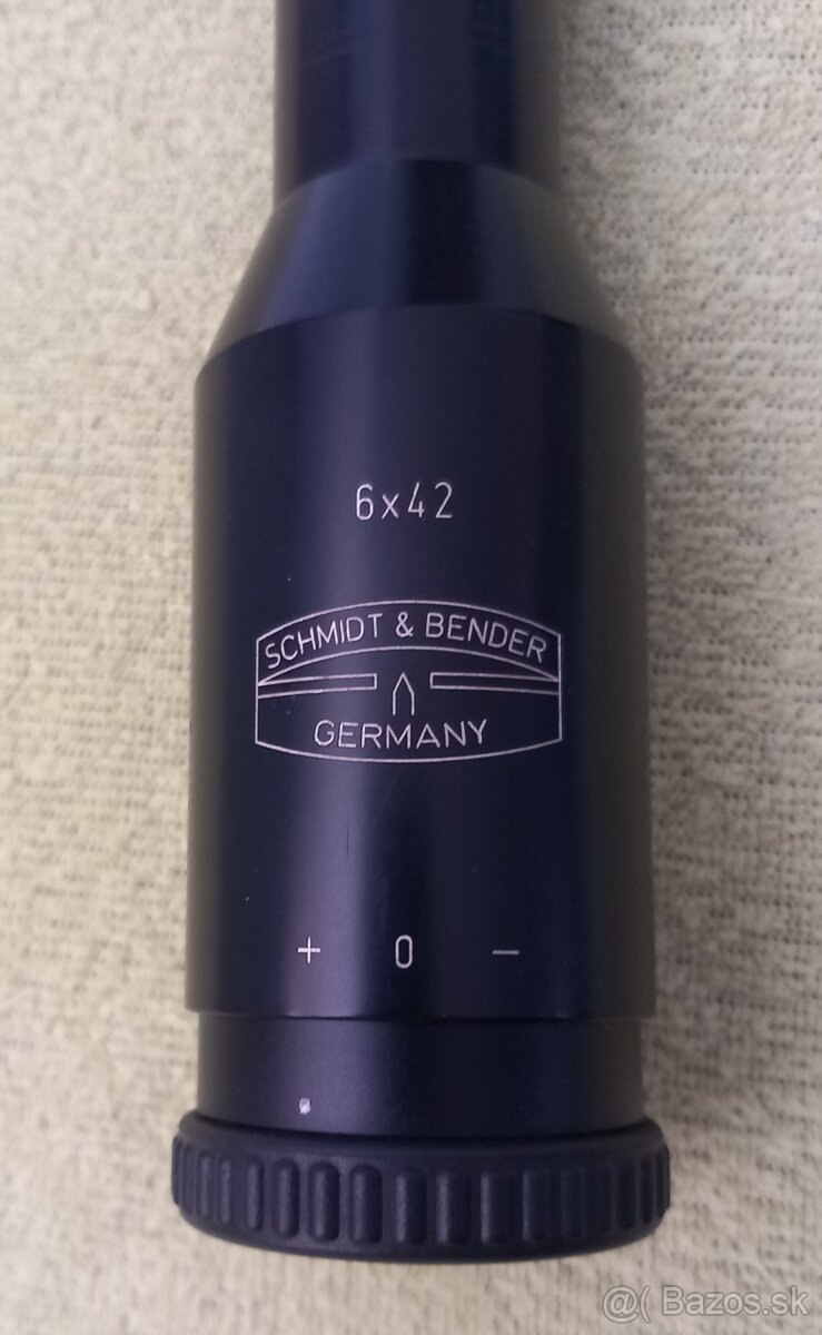 Ponúkam výborný klasický puškohlad Schmidt & Bender 6x42, tubus priemer 25,4mm - pekný iba so stopami lepu po predchádzajúcej montáži, šošovky aj antireflexné vrstvy vo vynikajúcom stave, mechanizmus ok, zámerná osnova klasické T, krytka objektívu Butler Creek. Celkovo puškohlad vo výbornom stave.