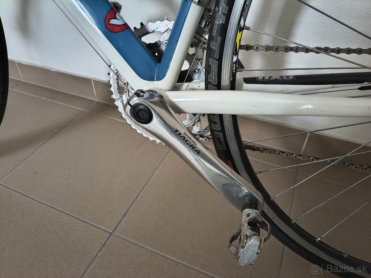 Predám starší cestný bicykel postavený na legendarnom superľahkom oceľovom ráme Columbus. Bike má len 9,5 kg! Má karbónovú vidlicu, pohon Shimano 2x9. Radenie 105, kľuky Tiagra, prehadzovace Sita. Predný rafik Mavic, zadný Remerx, náboje Shimano Tiagra, rafikove brzdy a plášte Schwalbe Estremo 23mm. Hlavové zloženie Cane Creek. Bicykel predávam s obyčajnými pedálmi.