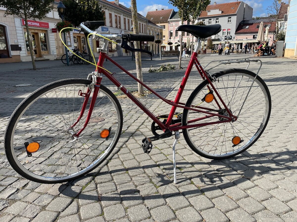 Z dovodu vysokeho poctu bicyklov redukujem flotilu - na predaj je tento Velamos Weekend oholený "do naha", pekna zachovalá farba a typicka a zaujimava na pohlad - dvojita ramova konstrukcia. Vhodny na mestske jazdenie, plne funkcny na okamzite pouzivanie. Ponechany ako single speed, na aktualnej dlzke retaze mozno "zaradit" 3 stredne prevody presunutim kolesa (cize mozete zvolit z 3 prevodov, ale musite si ho nachystat dopredu presrovobanim a ponusutim kolesa. Ja som na tom co tam je jazdil trvale a nepotreboval som do mesta nic ine)