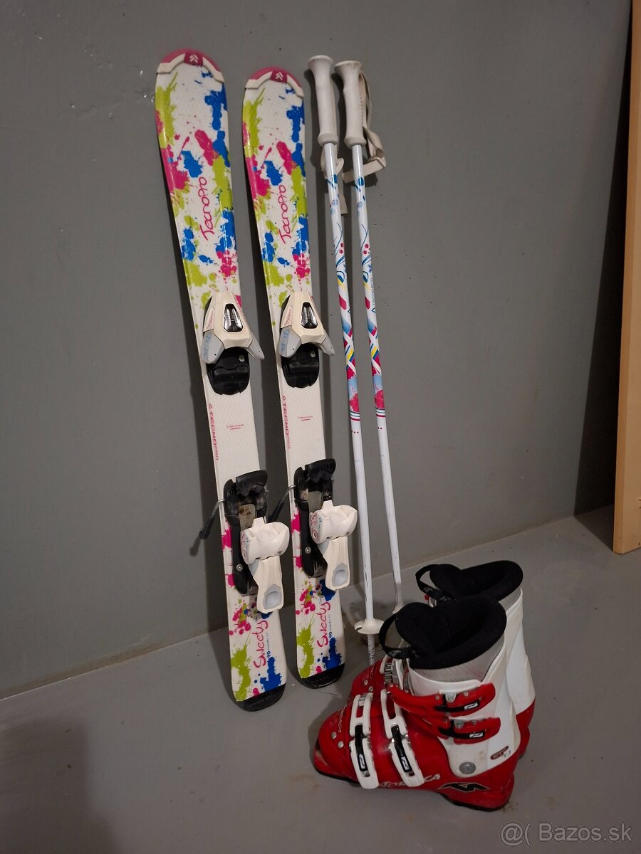 Predám detské lyže TecnoPRO Sweety 90cm + lyžiarky skelet 240cm papuče 190-205, lyž. Paličky 90cm