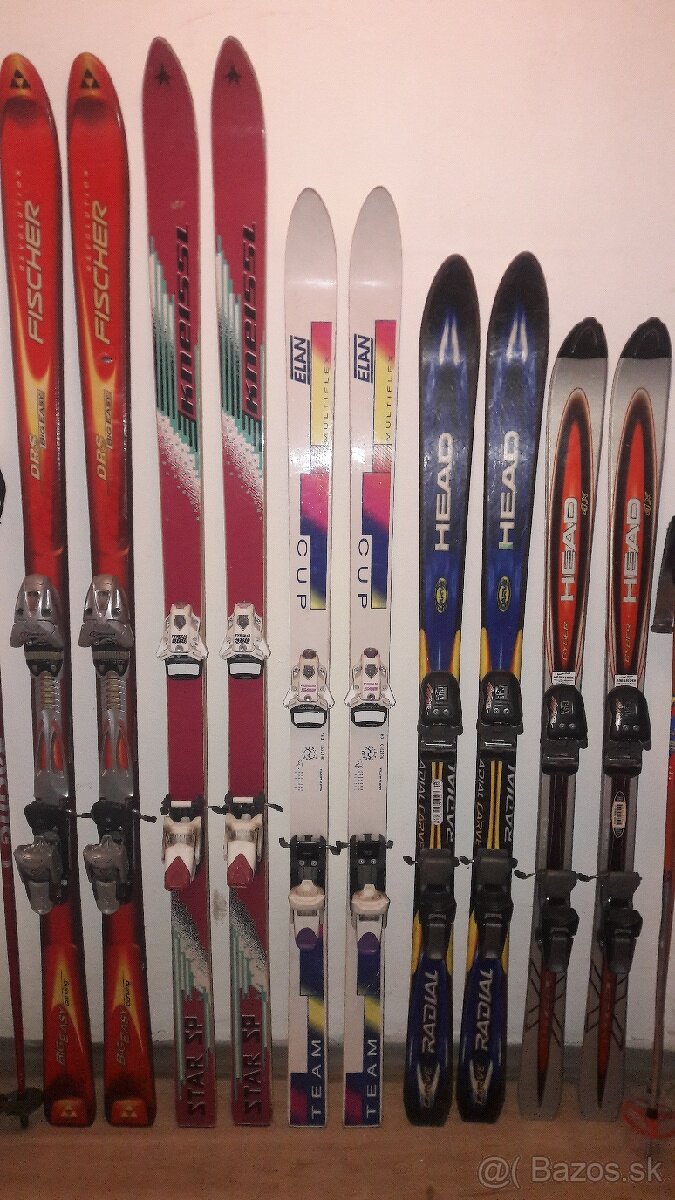Predám jazdené -zachovalé lyže, na fotografii zĺava-doprava.Fischer garving-viazanie Tyrolia cyber dĺ 180cm,Kneissl star sp-viaz.Tyrolia dĺ 180cm,Elán-viazTyrolia dĺ 160cm,Head carve radial-viaz.Marker dĺ 150cm,Head cyber-viaz.Marker dĺ 140cm. Cena:60€/1pár+palice.