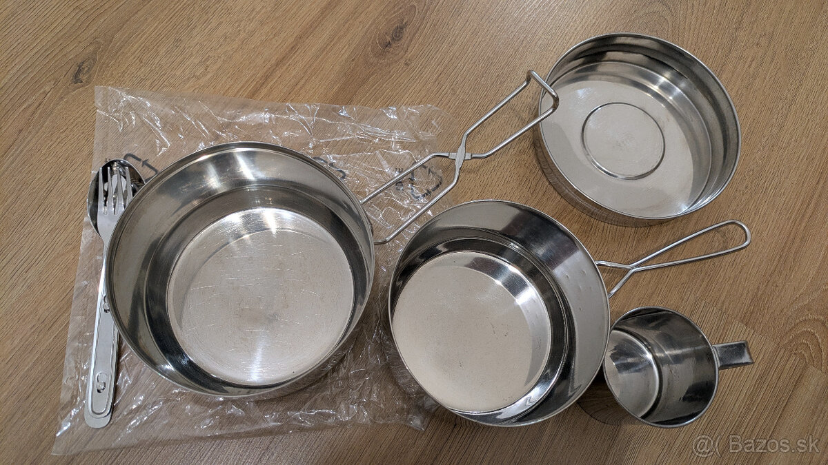 Predám rozbalenú, no nepoužívanú sadu nerezových ešusov s príborom na kempovanie. Sada sa dá zložiť do najväčšieho ešusu.
