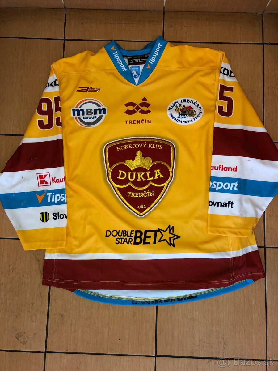 Predám hraný “Game worn” hokejový dres Dukla Trenčín zo sezony 2018/19, vydražený v aukcii Dukly. #95 Holenda, vyšívané logo, aplikované čísla, pre zberateľa. Možná výmena za HKM Zvolen. Možná dohoda na cene.