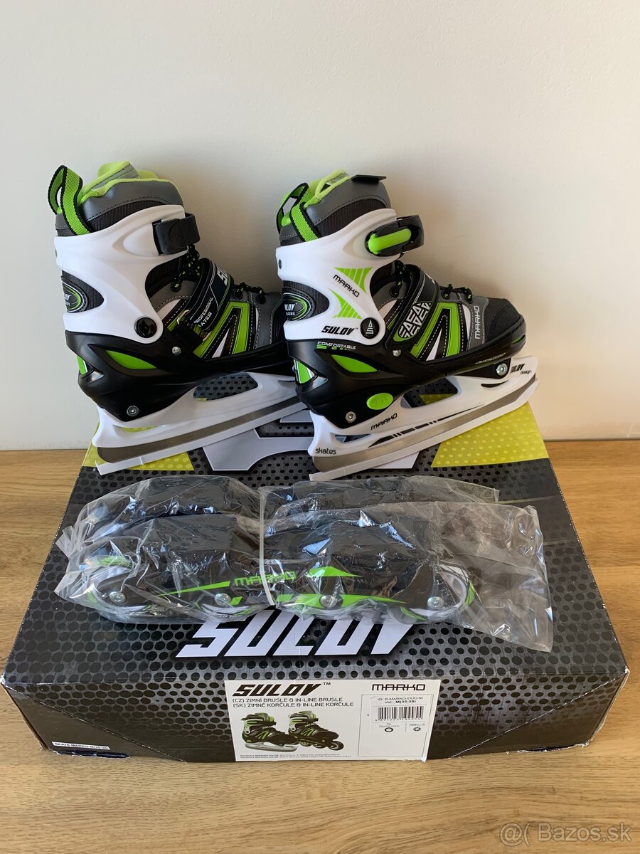 Predám chlapčenské nastaviteľné korčule 2v1 s vymeniteľným podvozkom na zimné alebo in-line korčuľovanie.